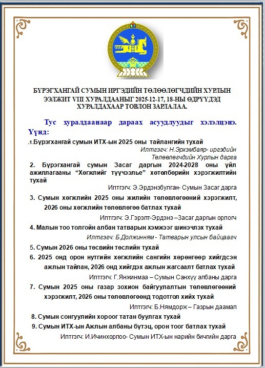 Бүрэгхангай сумын ИТХ-ын Зөвлөлийн хурал 2025.12.03-ний өдөр 71.4%-ийн ирцтэйгээр хуралдаж сумын ИТХ-ын ес дэх удаагийн сонгуулийн ээлжит VIII хуралдааны тов болон хэлэлцэх асуудлуудыг баталлаа.